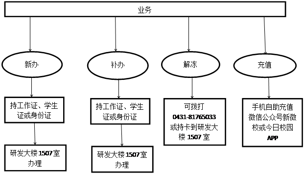 校园卡业务包括校园卡新办、补办、解冻、充值。老师、学生、校外人员可根据以下流程图进行办理。如有其他疑问可拨打电话0431-81765033。