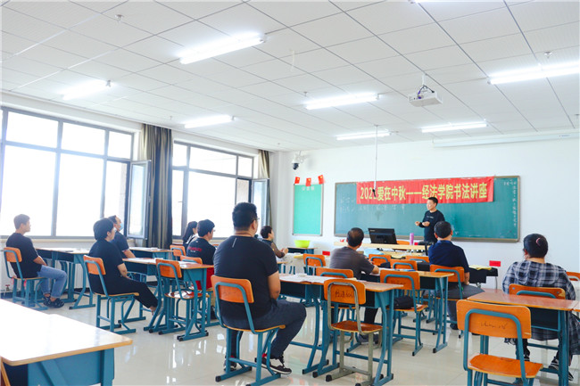 为大力弘扬中华优秀传统文化,丰富广大教职员工的业余文化生活,提高修养,陶冶情操,经法学院工会于9月15日14:30在第十一教学楼606教室举办了2021“爱在中秋”书法讲座。讲座由经法学院工会主席荣月老师主持,经法学院葛龙老师担任主讲嘉宾。