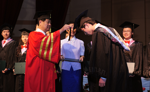 张伯军为2012届获学士学位和硕士学位的毕业生代表颁发证书,并进行学位授予仪式。