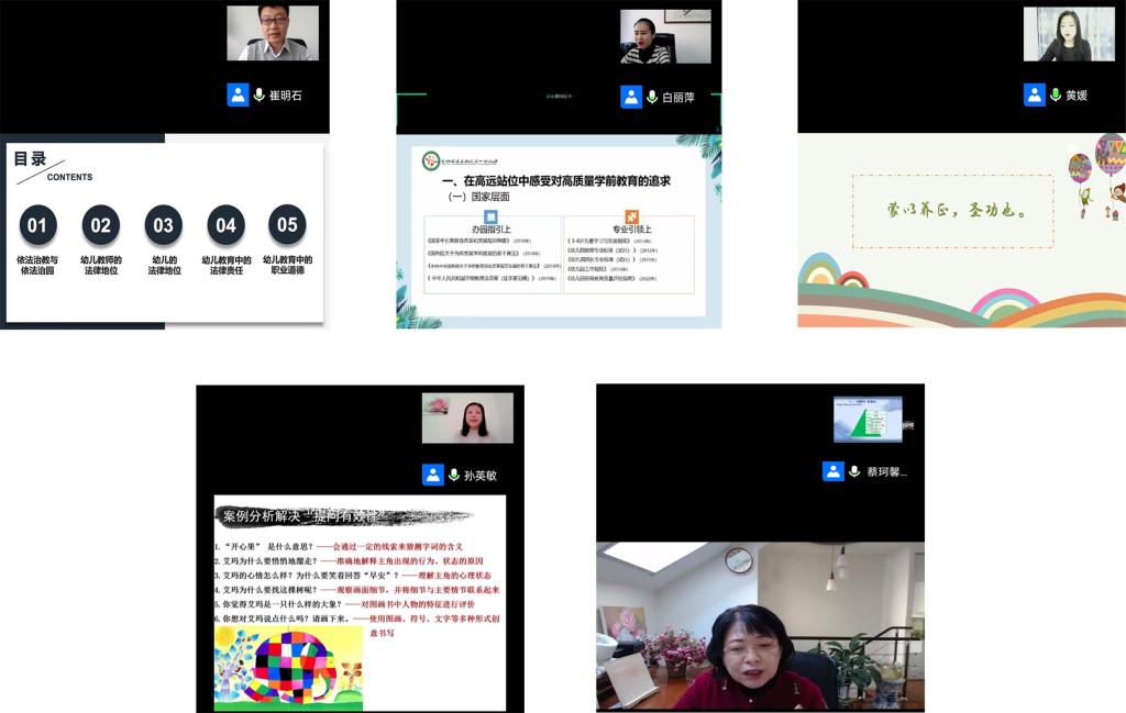 受疫情影响,本次培训采取线上培训方式。本次培训邀请省内外优秀专家作了十余场讲座,内容涵盖师德师风、专业标准解读、区域活动设计、园本课程案例、民办幼儿园的新法新政等;培训方式有专题讲座、案例分享、专题研讨、同仁分享等。全体学员睿思于课堂内外,围绕培训专题积极展开研修活动,学习专业理论,内化标准解读,撰写研修心得,提升园长修养。