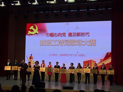为贯彻落实党的十九大精神,喜迎吉师六十华诞,永利官网于4月13日晚在音乐厅举办了“巾帼心向党,建功新时代”教职工诗词歌咏大赛。我院工会组织薛洪波、夏宇旭等21名教师组成代表队参加了本次活动。