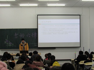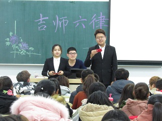王正攀、李承柳等六名同学分别表述了对“吉师六律”的认识,使同学们领悟到吉师六律的深刻内涵。本次班会除了为大家讲解如何践行“吉师六律”外,还增添了游戏和歌舞才艺表演等节目,为班会掀起一阵阵热潮。