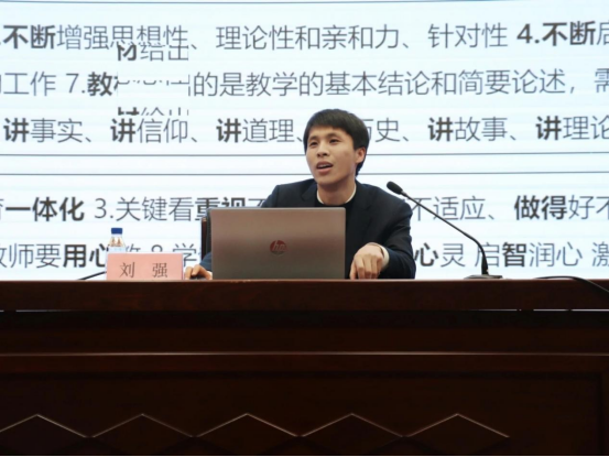 讲座伊始,刘强老师从定位青年教师身份导入,指明作为一名思政课教师需要符合的要求,并勉励同学们要做思想舆论战线的“战士”、教书育人一线的“志士”、热点时政前线的“能士”。