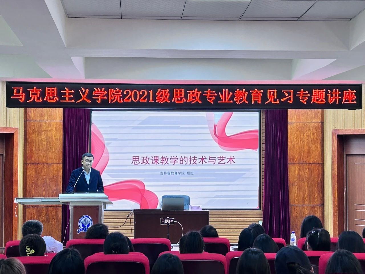 4月17日下午,我院特邀吉林省教育学院教研员桓旭,为同学们带来一场主题为“思政课教学的‘技术’与‘艺术’”的专题讲座。桓旭老师以深入浅出的叙述方式和幽默风趣的语言风格,从教学实施的结构优化、教师专业发展路径、非语言表达等多角度出发,对“思政课教师如何实现教学实施的结构优化”这一问题进行详细讲解。本场讲座激发了同学们对桓旭老师“要做好教学,就要掌握和学生对话的艺术”的深入思考,全程讨论氛围浓厚、思辨性极强,同学们积极参与互动,热情高涨。