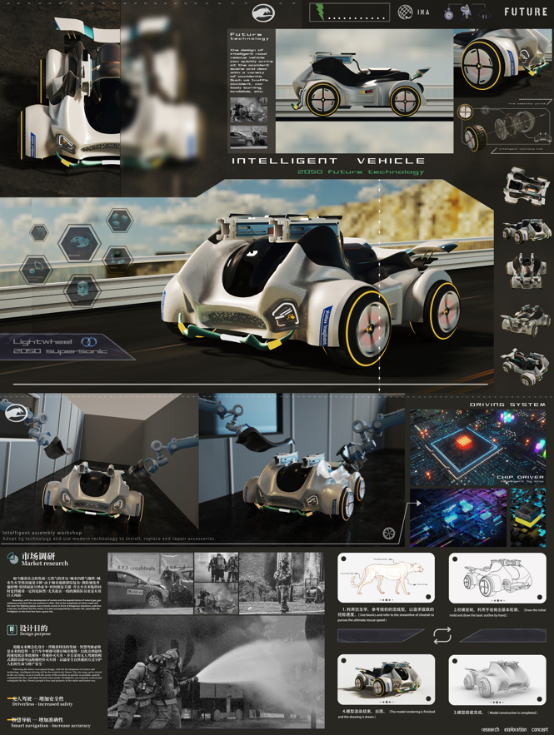 李莹、刘昊天《智慧城市无人驾驶消防车概念设计》90×120cm 产品设计