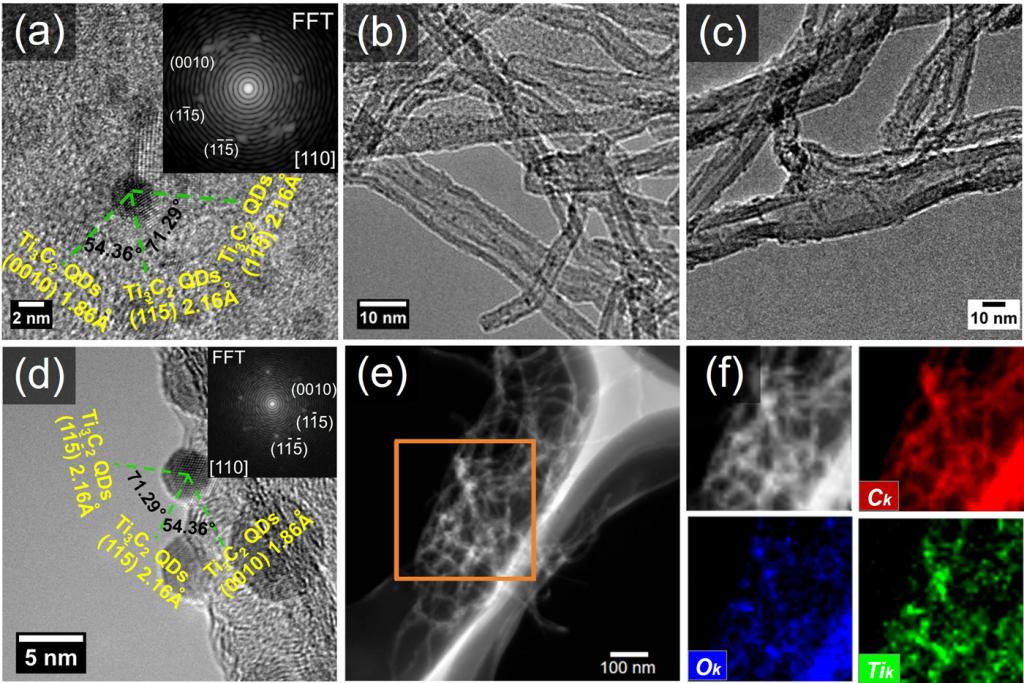 图2:Ti3C2QDs、Ti3C2QDs@CNTs复合材料的TEM图及元素分布图
