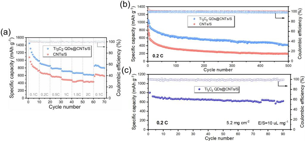 电化学测试表明,Ti₃C₂ QDs@CNTs/S电极在0.1 C电流密度下初始容量达1450.3 mAh g⁻¹,2 C倍率下仍保持620.96 mAh g⁻¹(图5)。经过500次循环后,每圈衰减率仅0.121%,远优于传统CNTs/S电极(0.157%)。即使在高硫负载(5.2 mg cm⁻²)和低电解液用量(E/S=10:1)条件下,电极仍表现出620.11 mAh g⁻¹的高可逆容量,展示出优异的工程化潜力。