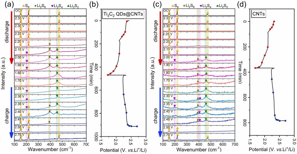 原位拉曼光谱(图4)显示,Ti₃C₂ QDs@CNTs电极在充放电过程中,多硫化物(Li₂S₆、Li₂S₄)的特征峰强度显著低于传统CNTs电极,且峰位偏移更小,表明量子点催化加速了多硫化物的液相转化,减少了中间产物的积累。此外,Li₂S的成核峰出现时间提前至1432 s(CNTs电极为2880 s),进一步证实了催化活性的提升。