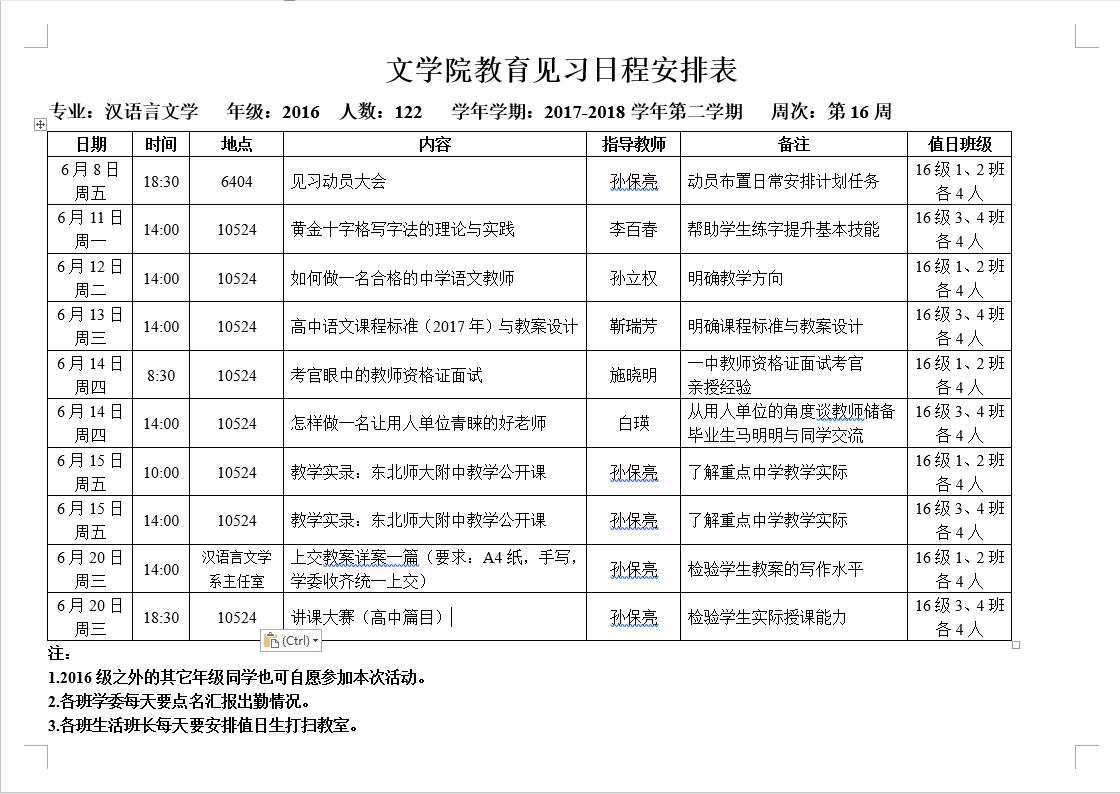 汉语言文学专业2016级教育见习日程安排表